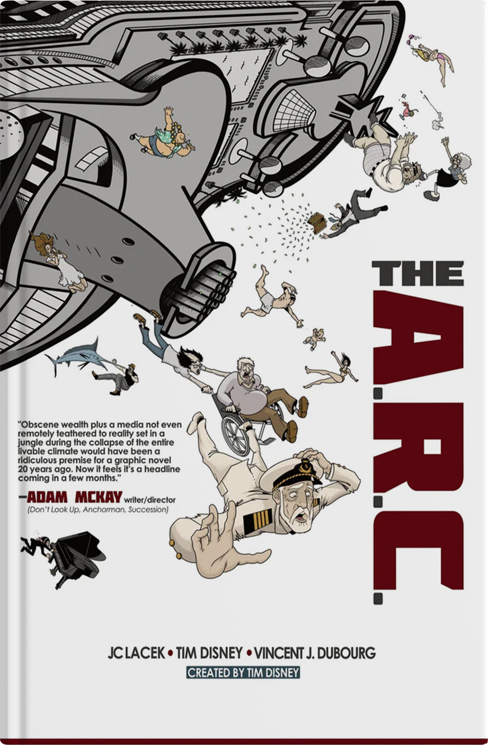 “The A.R.C. is a ferocious, globe-spanning graphic novel that takes aim at the parasites of the modern world―billionaires strip-mining the planet, sanctimonious pastors, phony country singers, hustling young douchebags on the make, and bigots, beefheads, and boors of every imaginable stripe. Tim Disney and JC Lacek skewer capitalist exploitation, climate catastrophe, the commercialization of everyday life, and the hollow theatrics of performative do-gooderism with equal parts rage, dark humor, and clarity of purpose. The massively talented Vincent Jolas Dubourg’s artwork is a revelation on every page: kinetic, inventive, and endlessly surprising, bursting with motion and visual ideas that elevate the satire into something visceral and alive. The A.R.C. doesn’t comfort or flatter―it attacks, exposes, and exhilarates. It is angry and ambitious work, unafraid to name names.”